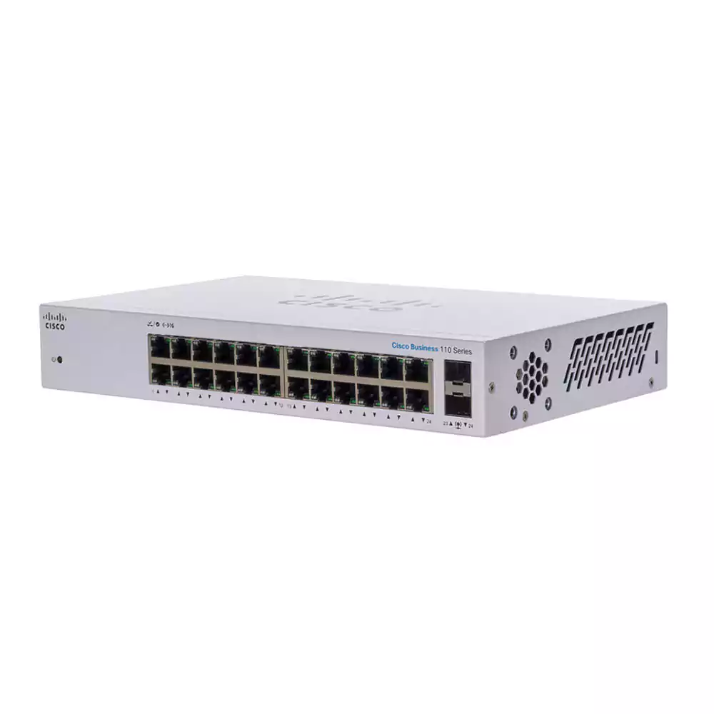 سوئیچ سیسکو CBS110-24T دارای 24 پورت اترنت گیگابیت یا 10/100/1000 مگابیت برثانیه و 2 پورت کمبو است همانطور که در بالا گفتیم این سوئیچ از نوع غیر مدیریتی در لایه 2 شبکه فعالیت میکنید سوئیچ سیسکو CBS110-24T قابلیت انتقال اطلاعات و دیتا با سرعت بالا را دارد.